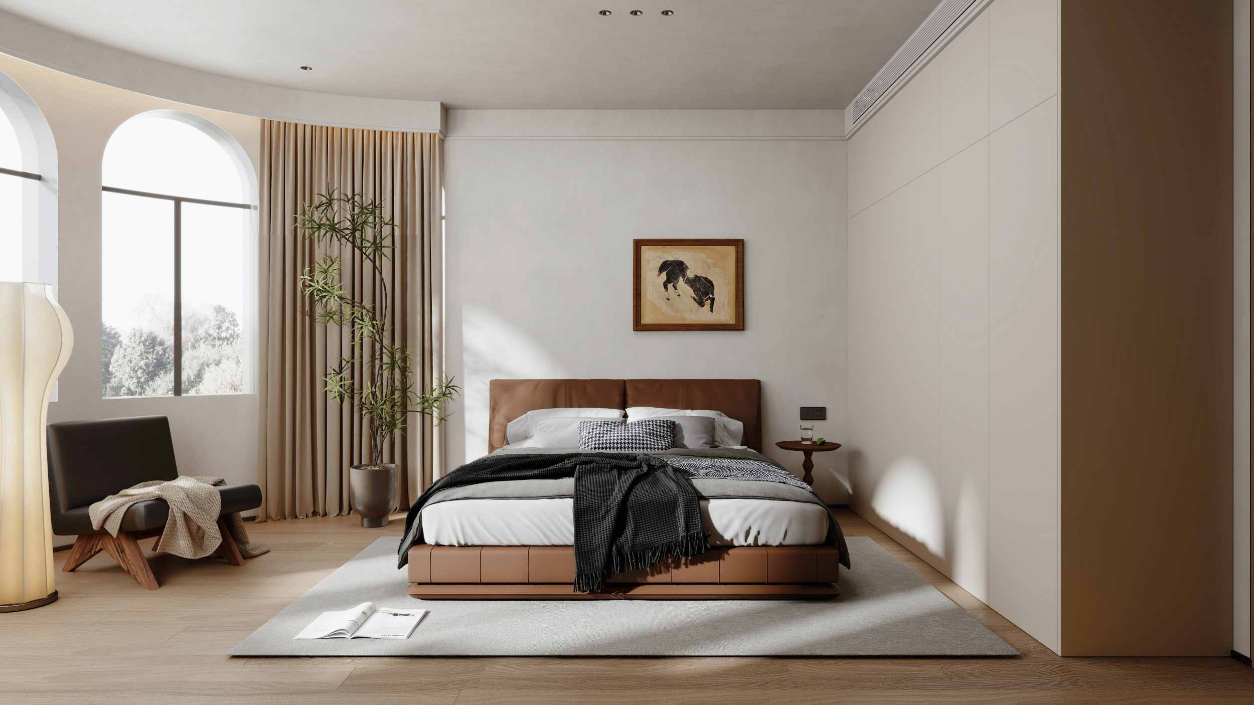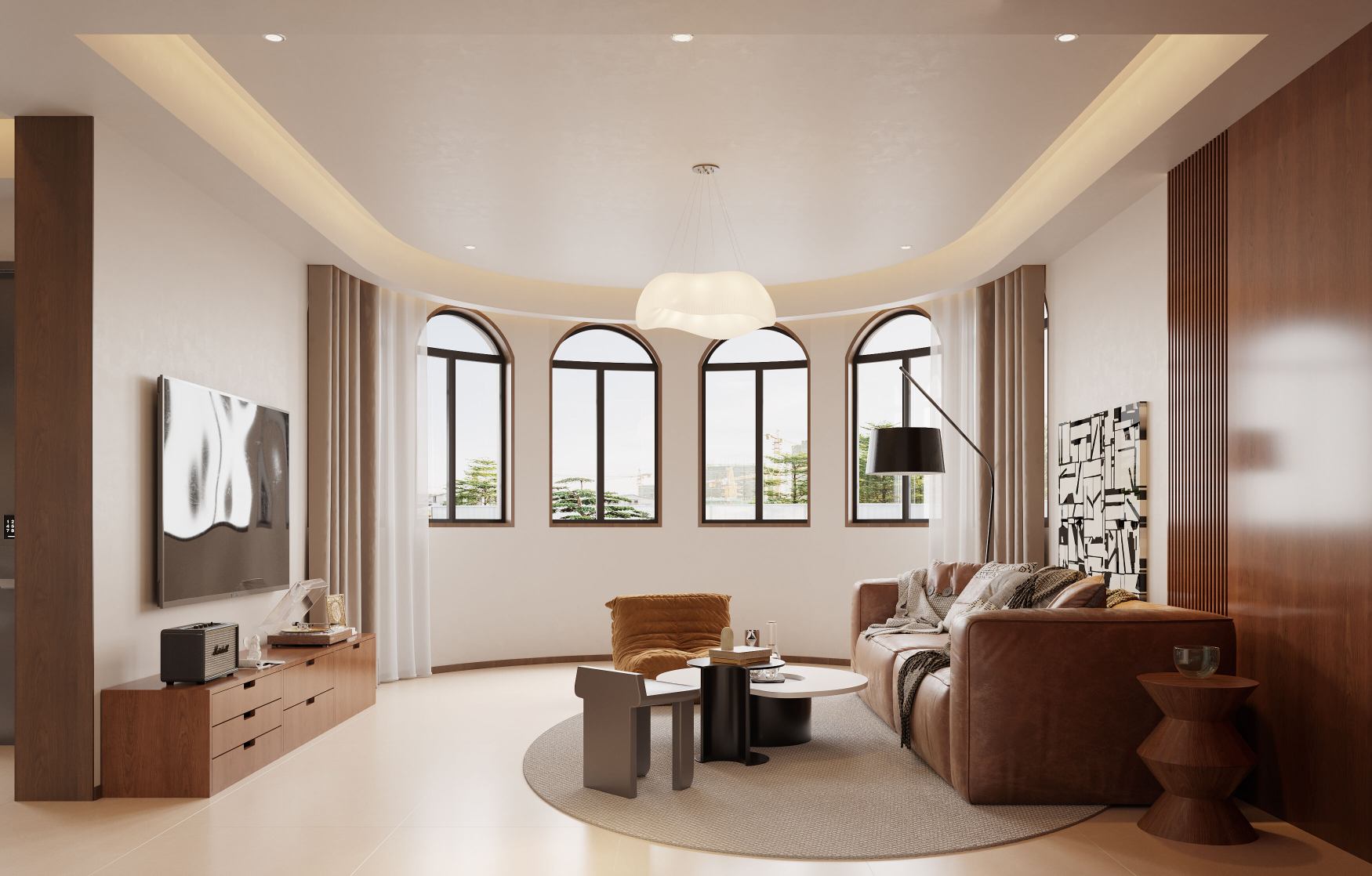 曲线造型吊灯与艺术装饰画呼应,柔化空间棱角,细节处体现精致感。
