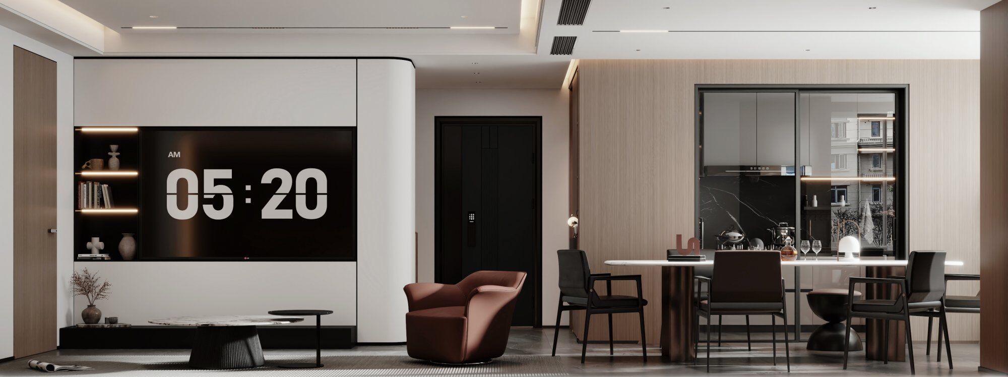 大尺寸电子时钟屏替代传统装饰,强化科技感与功能性的融合。