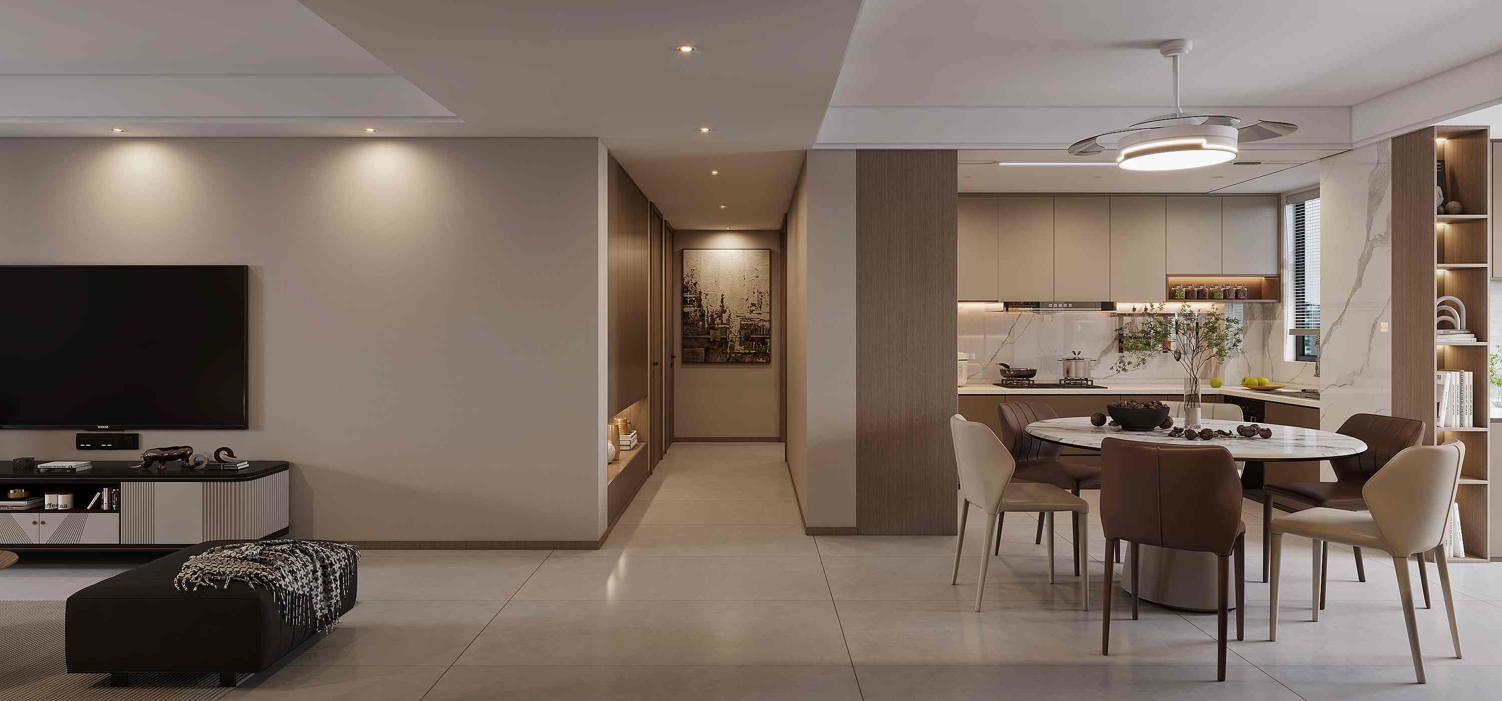现代简约风格,以柔和的暖灰色调为主,搭配木饰面与金属元素,通过无主灯设计、悬浮式玄关柜与通透的客餐厅布局,营造出温馨雅致且富有层次的居住氛围。