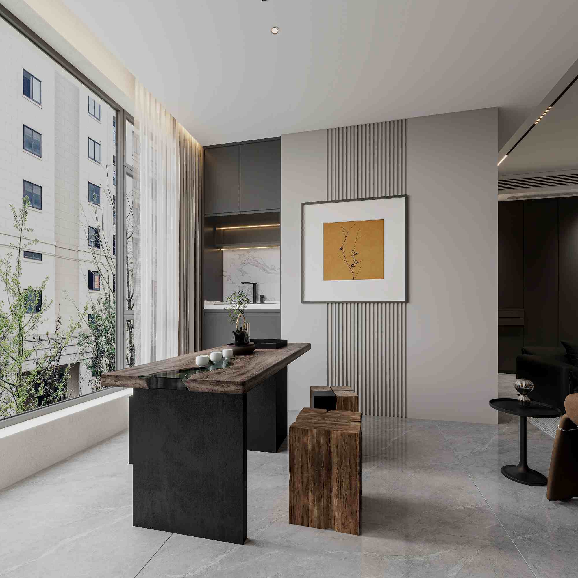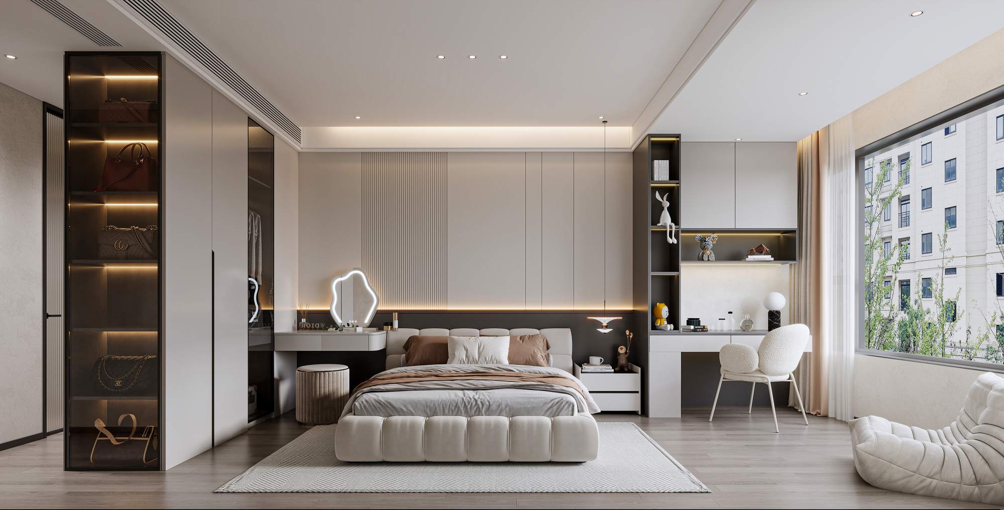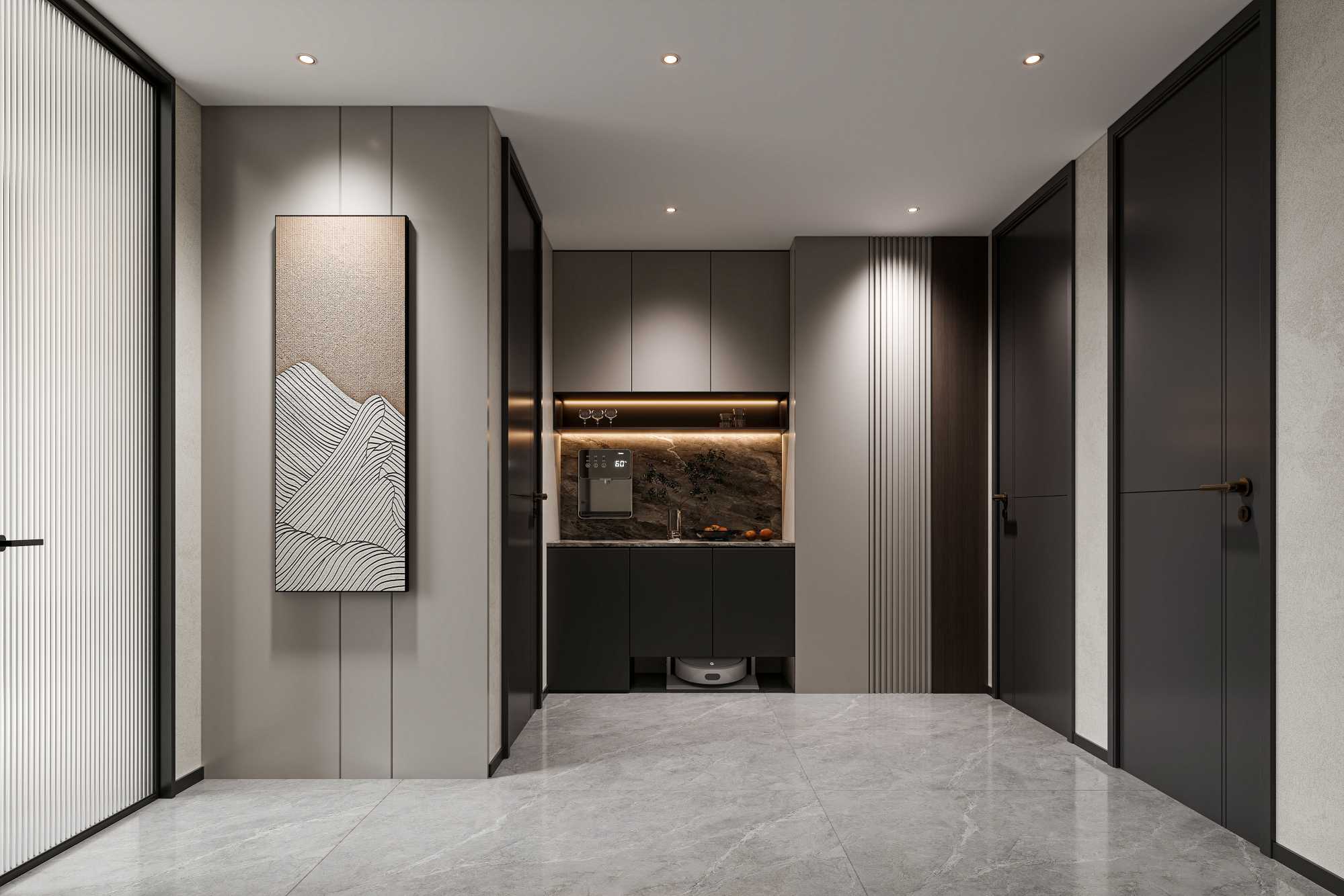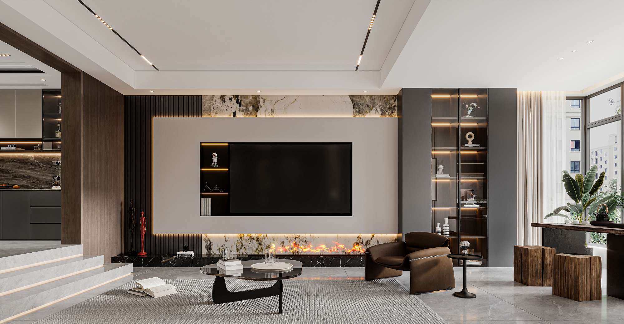 现代轻奢风格,以深木色、灰色与白色为主调,搭配岩板、金属线条与电子壁炉,通过悬浮式电视墙、无主灯设计与通透玻璃柜,营造出沉稳奢华且富有科技感的高端居住体验。