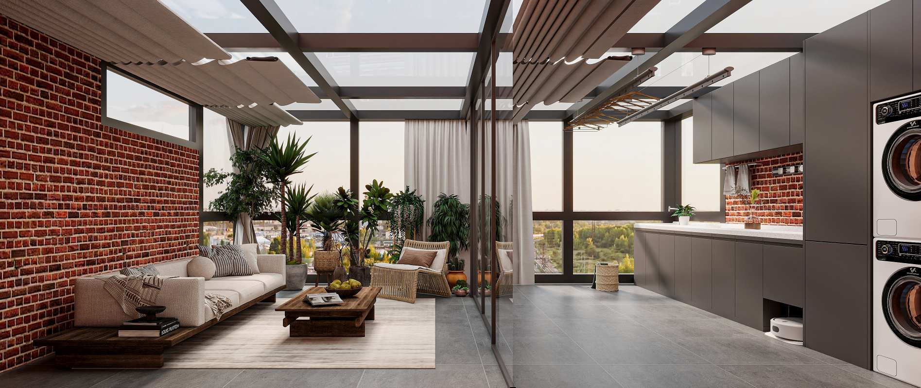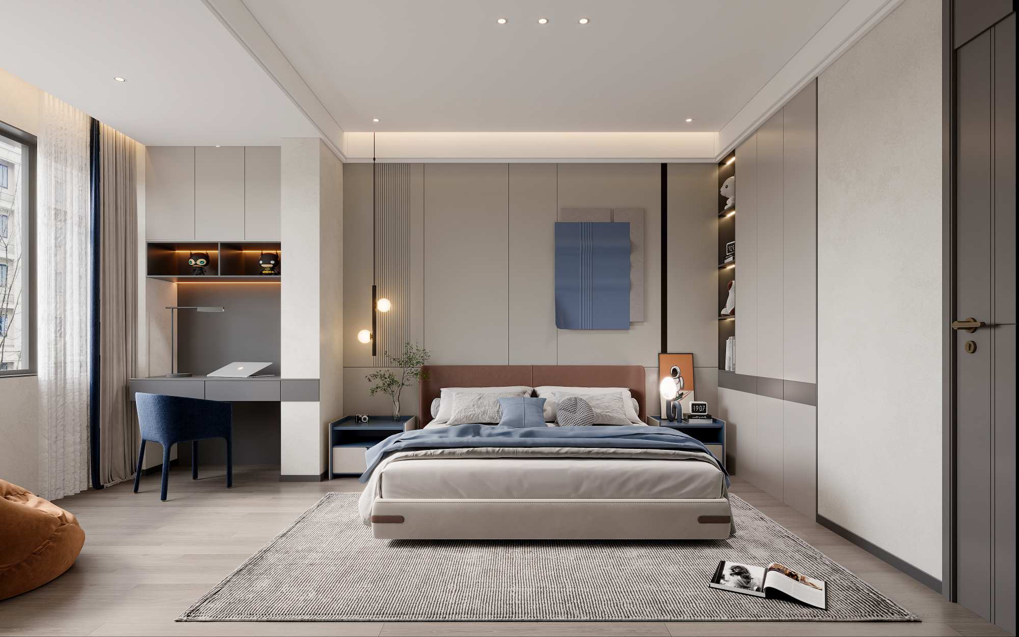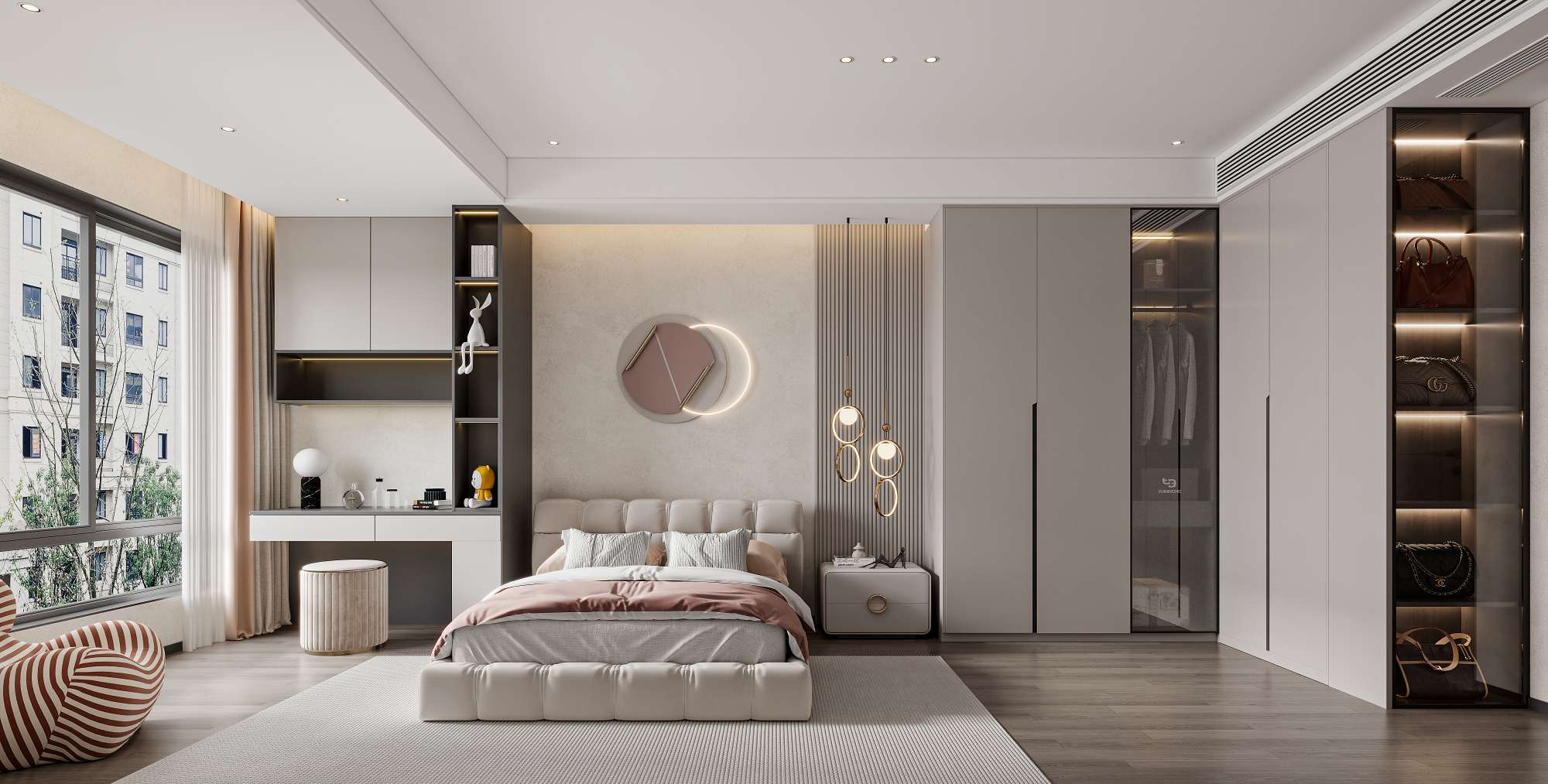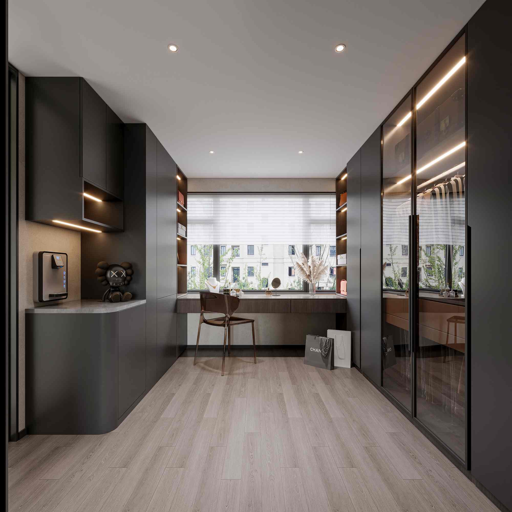 现代轻奢风格,以深木色、灰色与白色为主调,搭配岩板、金属线条与电子壁炉,通过悬浮式电视墙、无主灯设计与通透玻璃柜,营造出沉稳奢华且富有科技感的高端居住体验。