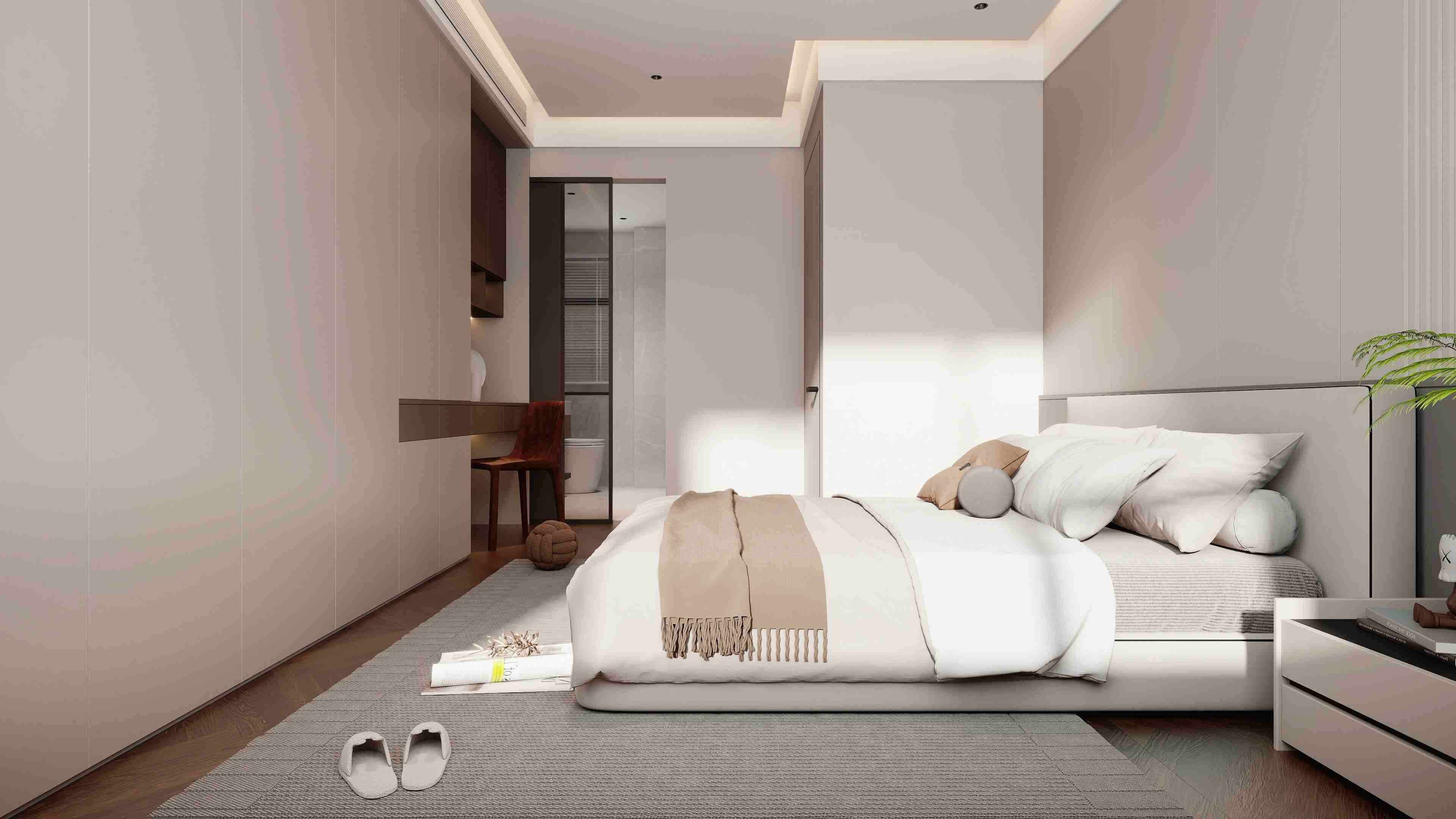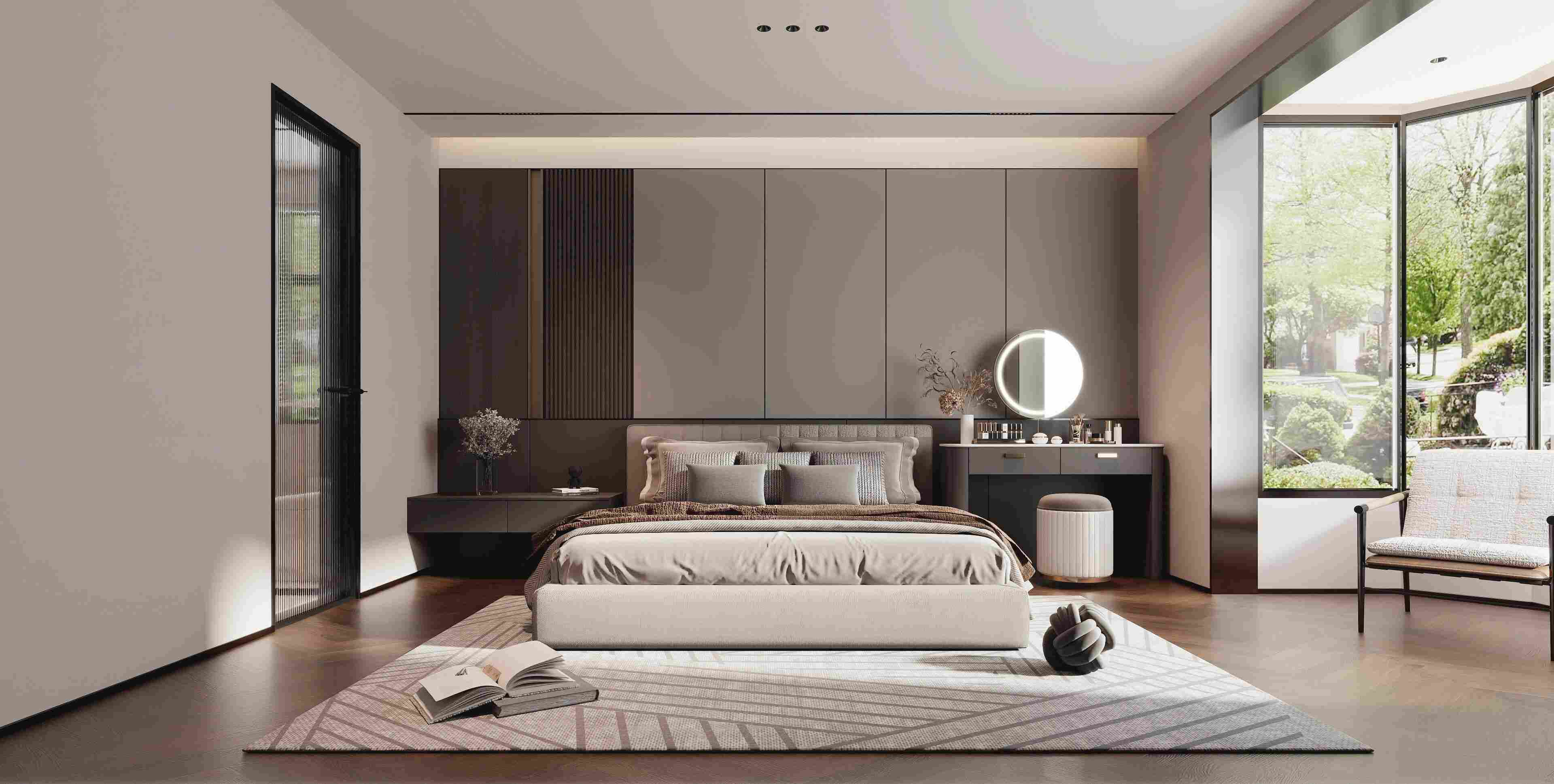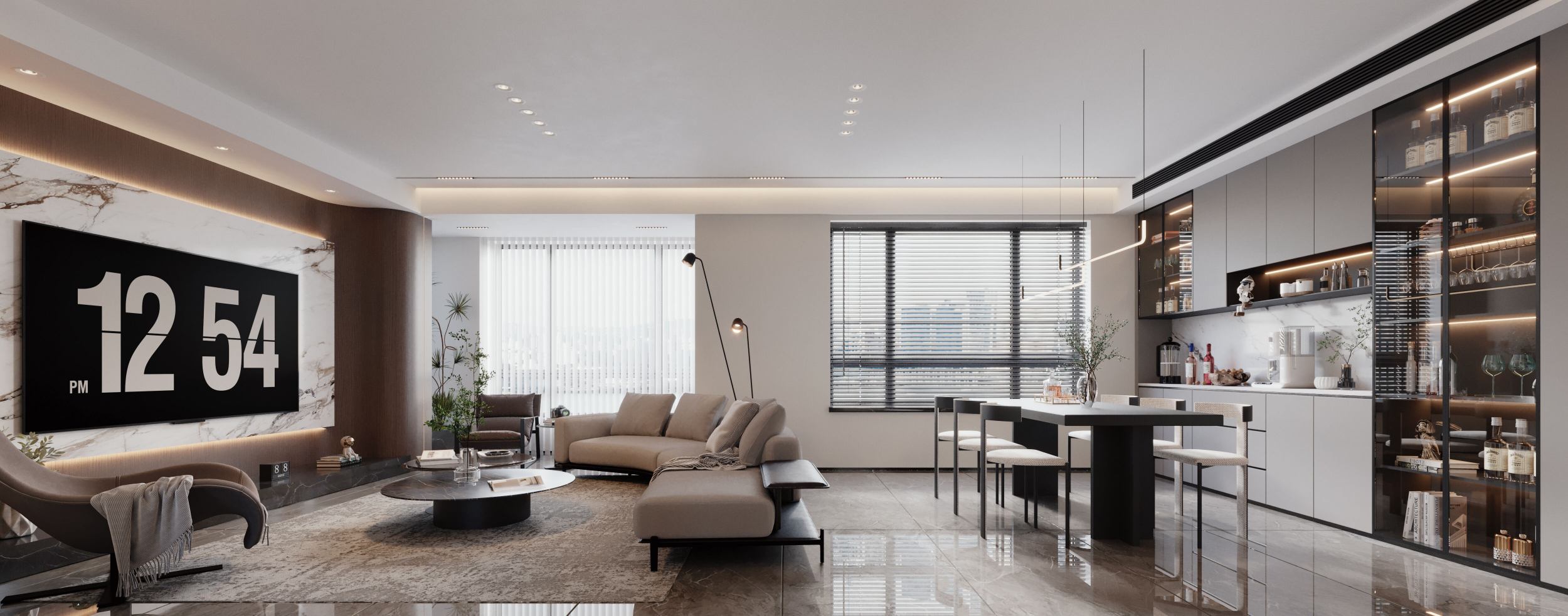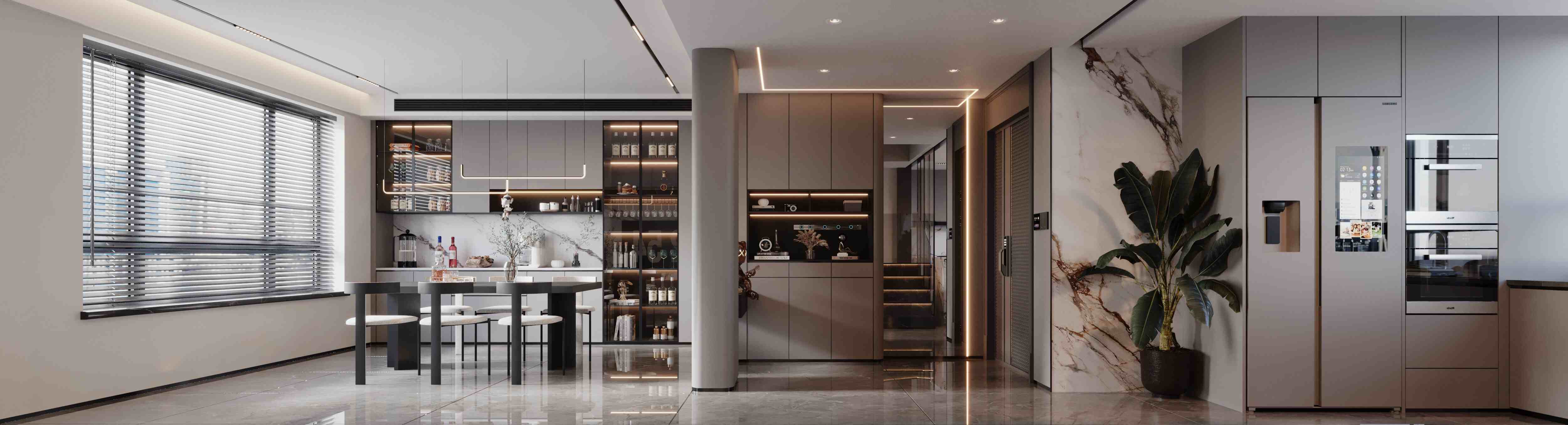 以黑白灰为主调,搭配木饰面与玻璃元素,通过悬浮式岩板电视墙、玻璃楼梯与无主灯设计,营造出通透大气且富有层次的高端居住体验。
