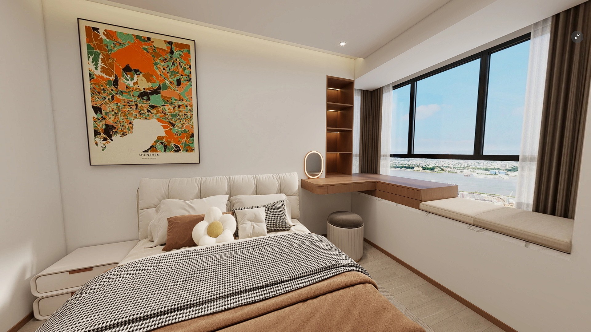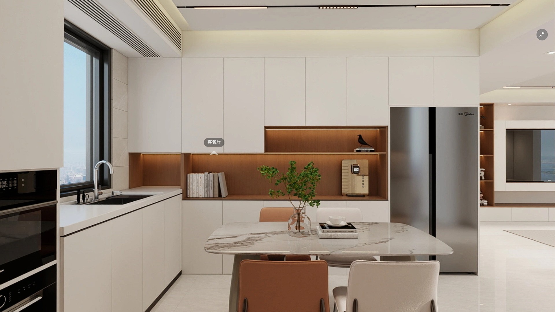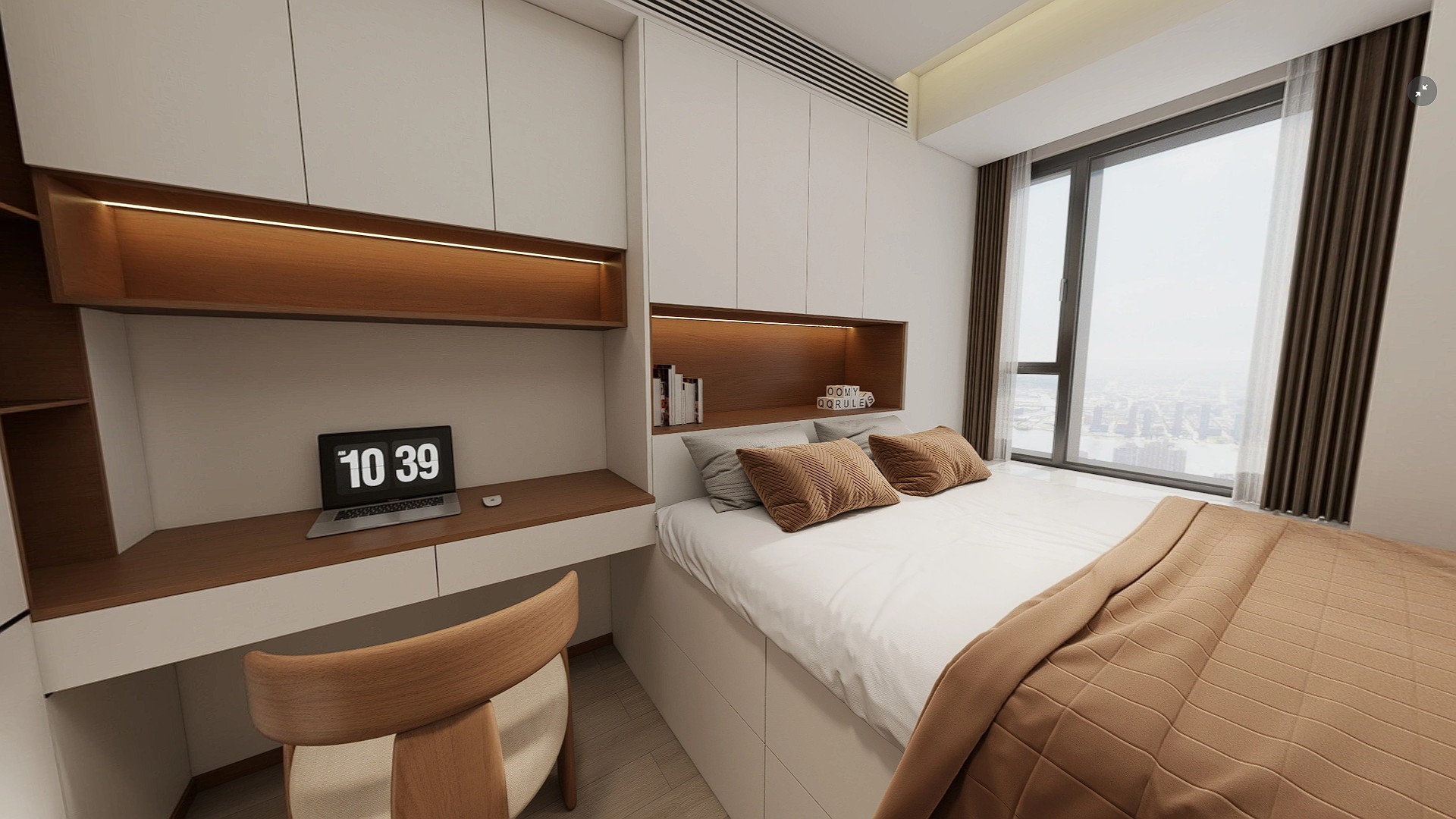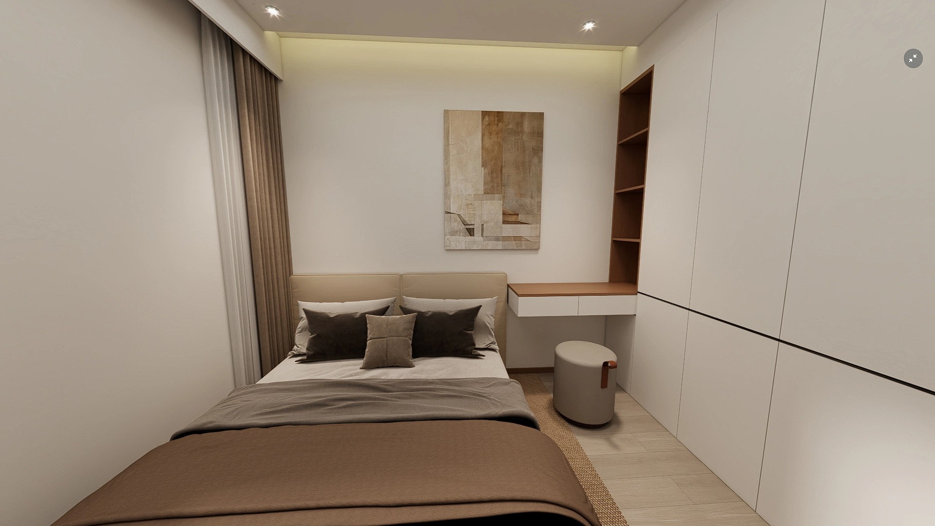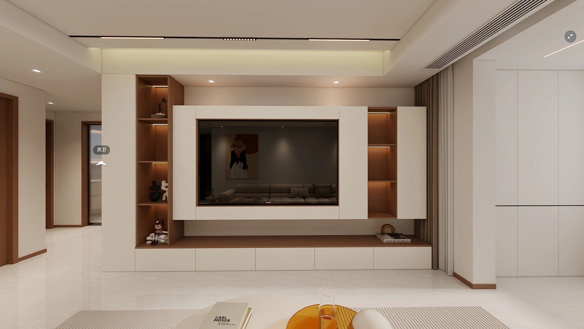 现代简约风格,以暖白与原木色为主调,搭配无主灯设计与一体化电视柜,营造出温馨通透、兼具收纳与质感的居家氛围。