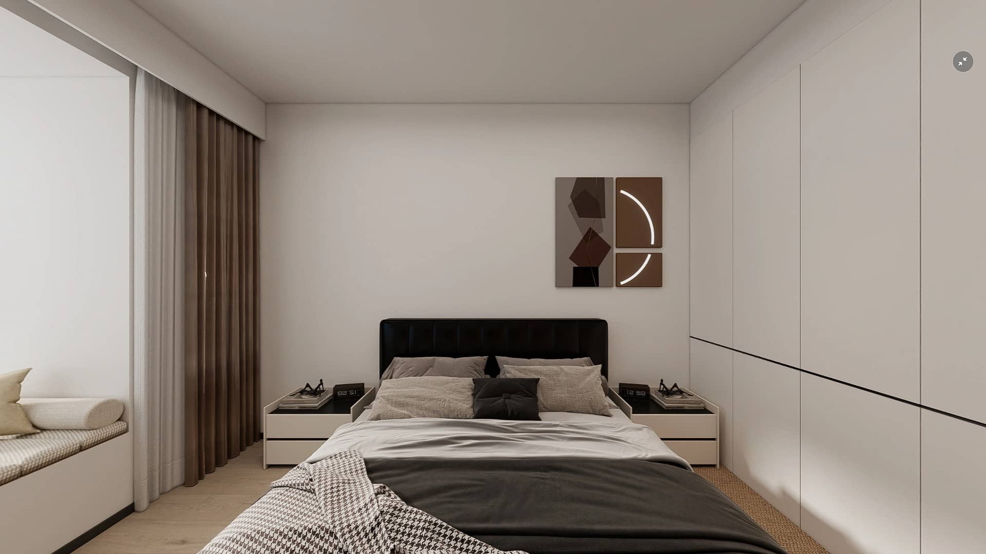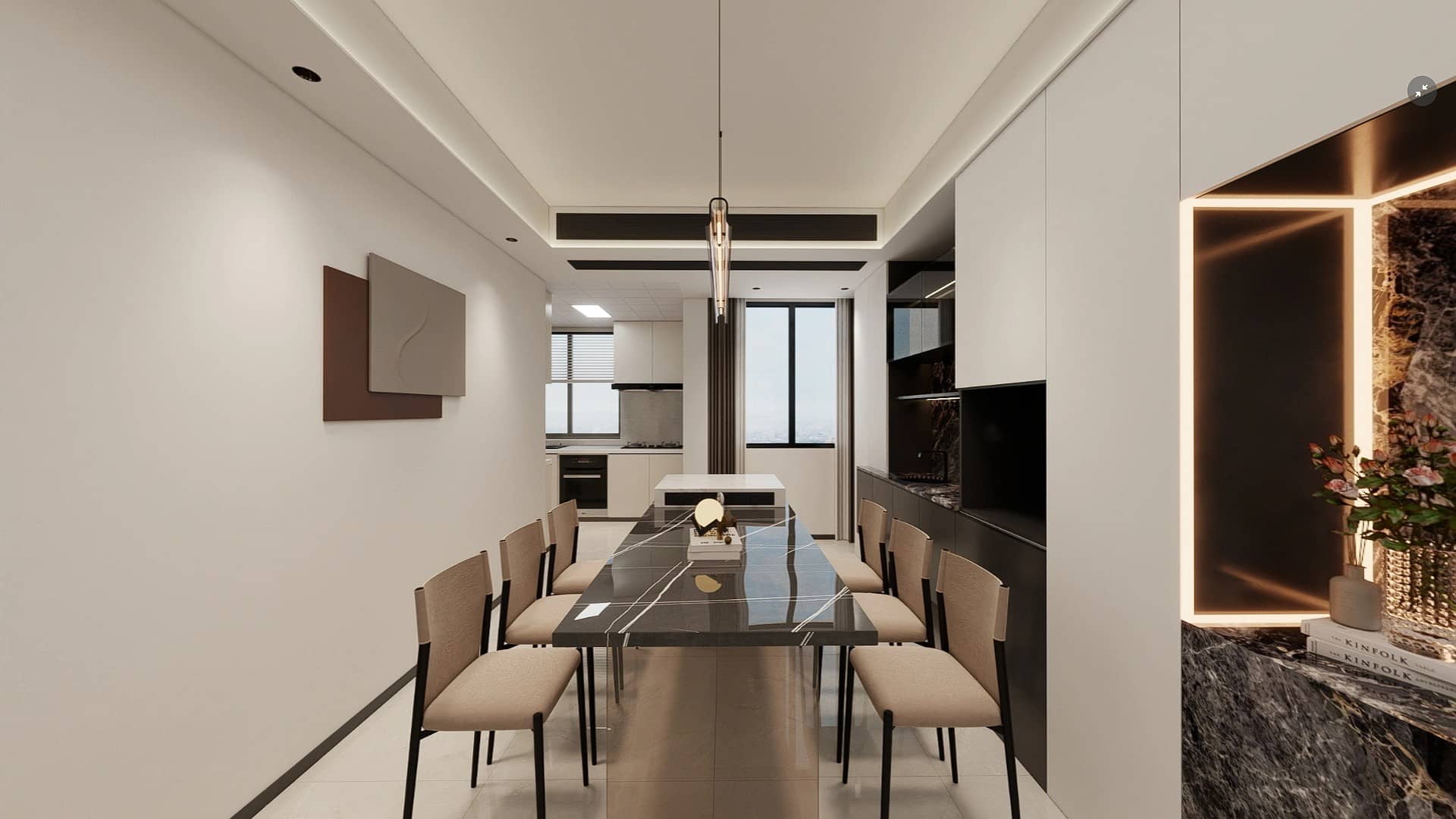 现代意式轻奢风格,以深木色、黑白灰为主调,搭配岩板与金属线条,通过悬浮式电视墙、无主灯设计与通透大窗,营造出沉稳高级、质感拉满的居住空间。