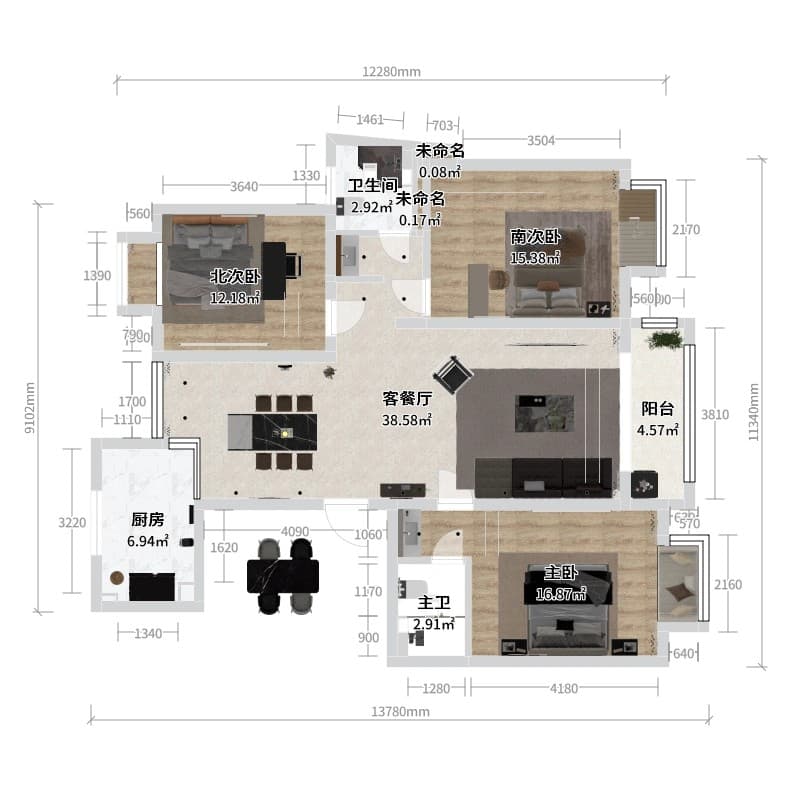 格局方正的三房双卫户型,客餐厅一体化开阔通透,动静分区清晰,采光通风俱佳。可优化入户玄关收纳,提升空间利用率与居住舒适度。