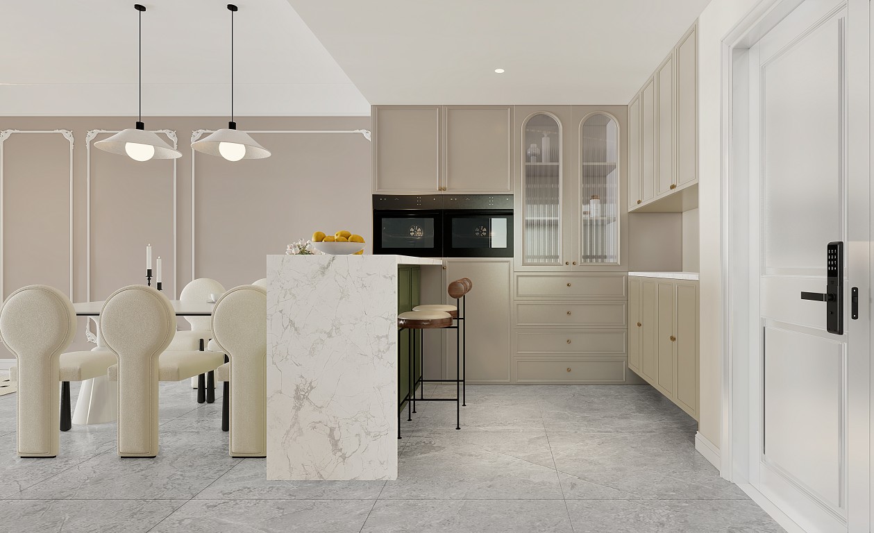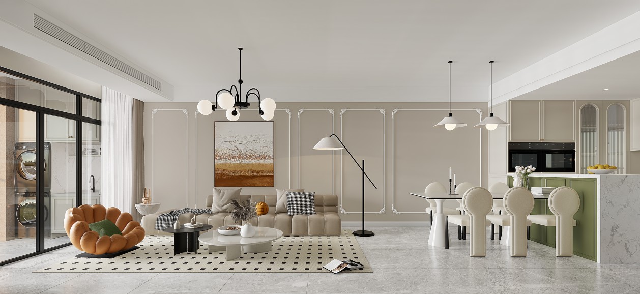 多采用柔和的自然色调,如米白、浅灰、淡蓝、奶油色等,营造出轻盈、温馨的氛围。墙面常搭配石膏线装饰,或采用复古壁纸(如碎花、条纹、卷草纹),增添自然气息。