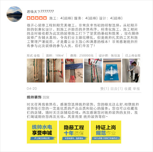 因为水电充分的专业自信,出色的实操能力和对结果负责的责任意识, 公司率先提出了“隐蔽工程质保10年”的承诺, 成为第一家质保时效高于行业标准的企业。 公司以高于行业标准的施工,提升了隐蔽工程的施工质量, 让后期的维修大大降低,隐蔽工程中最常见的爆水管, 电源过载引起火灾等问题得到了有效避免, 至今10多年前的老业主们仍对水电的施工品质念念不忘。