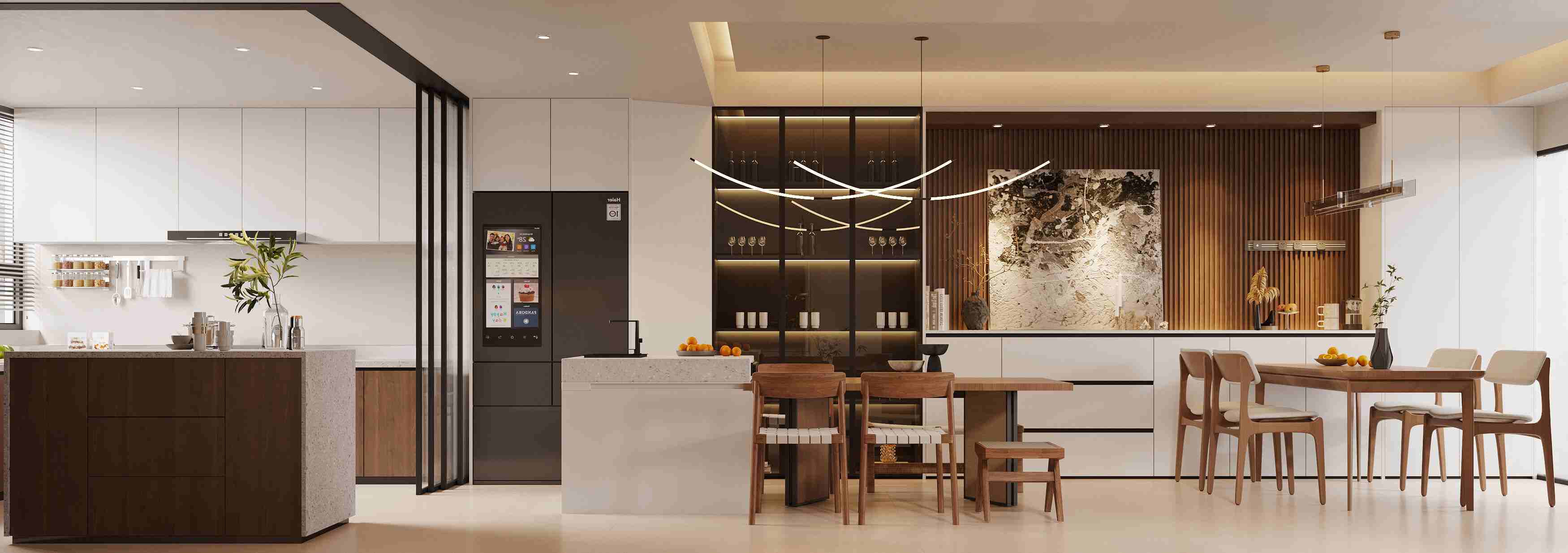 嵌入式智能冰箱 + 高柜酒柜,实现功能与收纳一体化,玻璃门 + 内嵌灯带提升轻奢氛围;