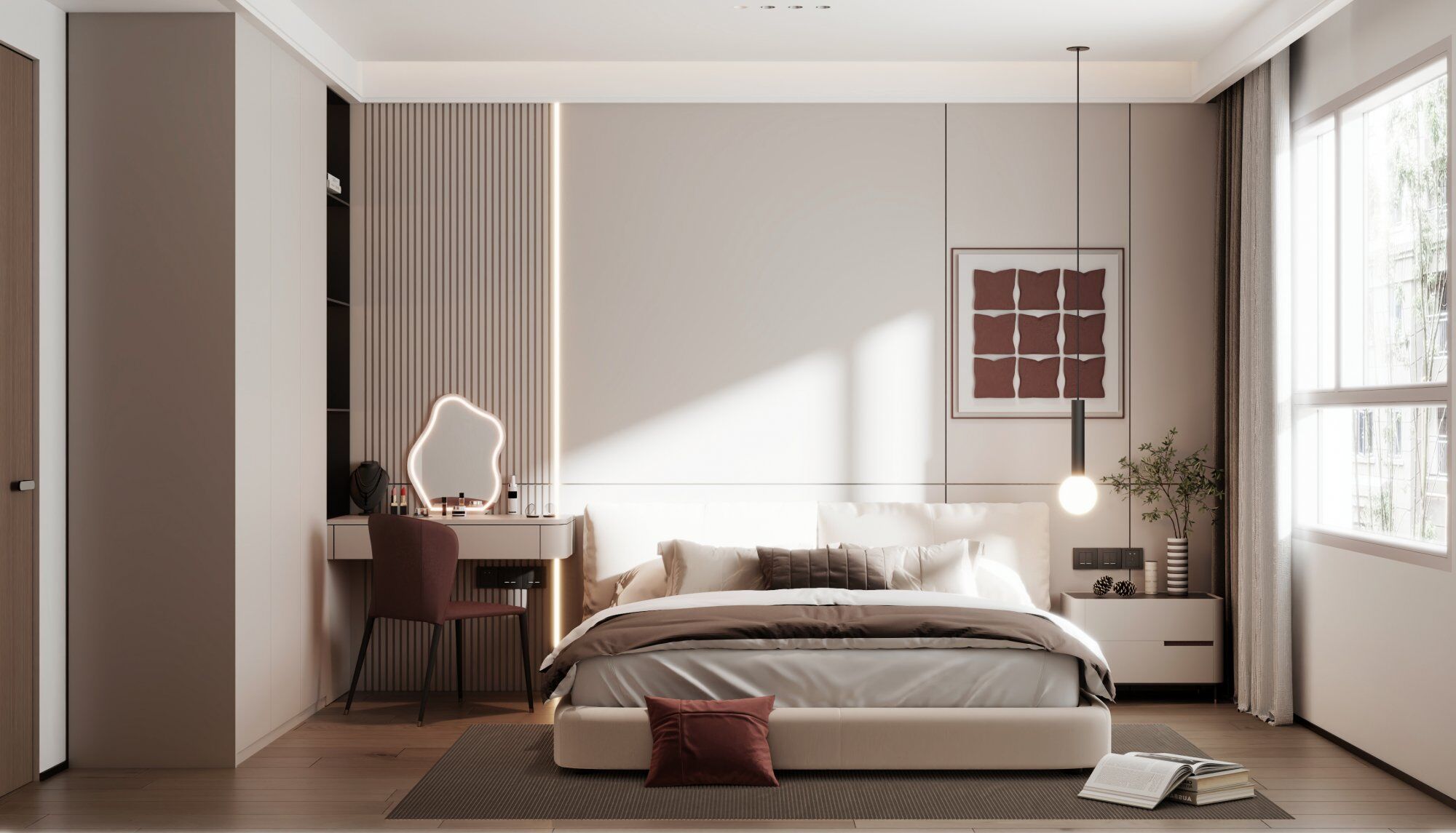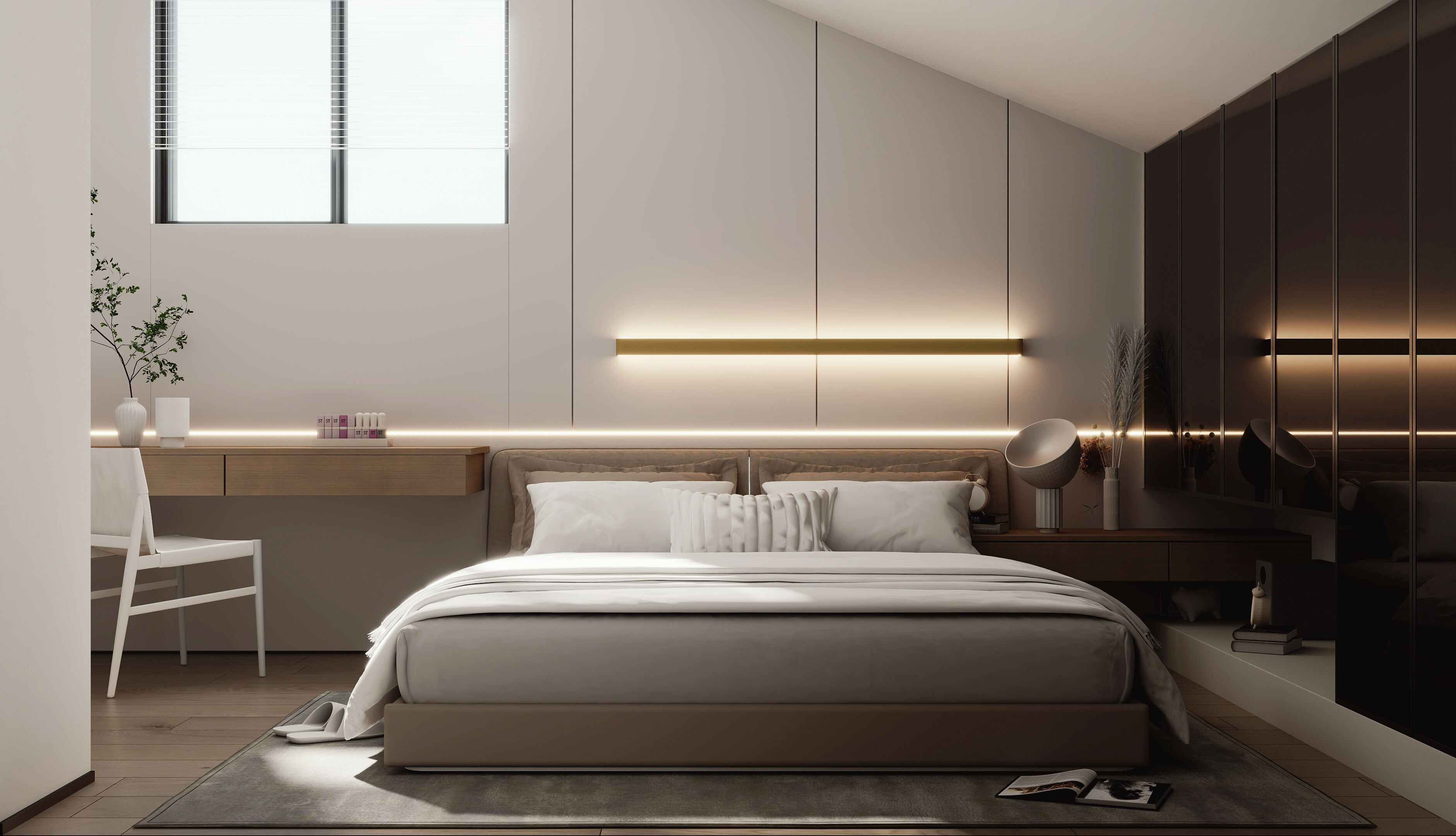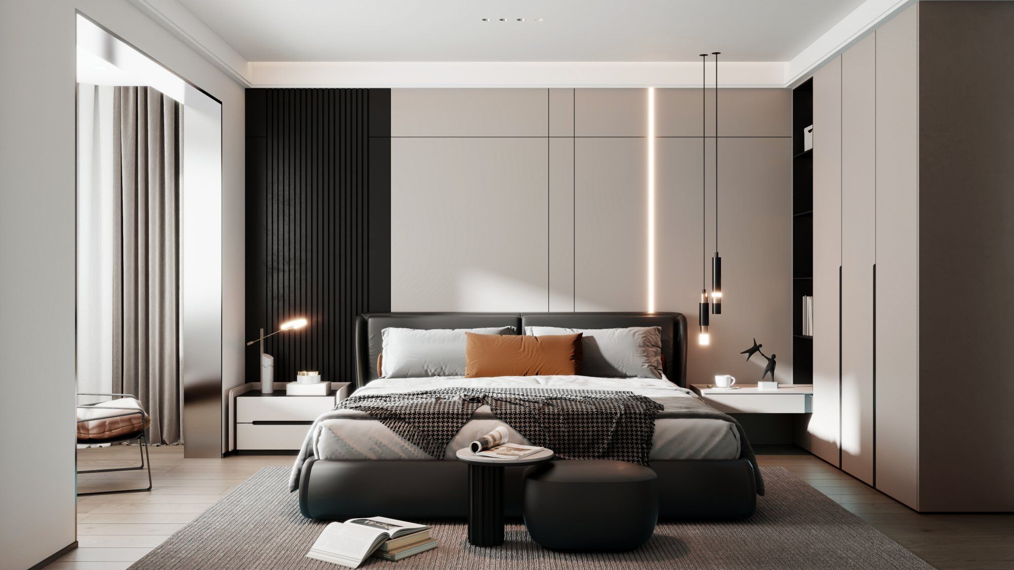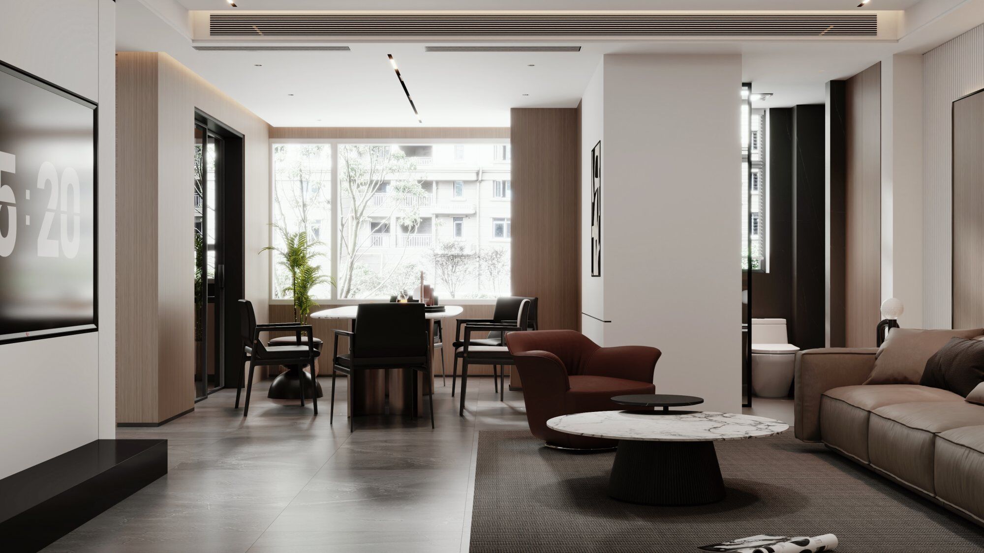 弧形墙体 + 无主灯设计,柔化空间边界,提升现代极简气质;
