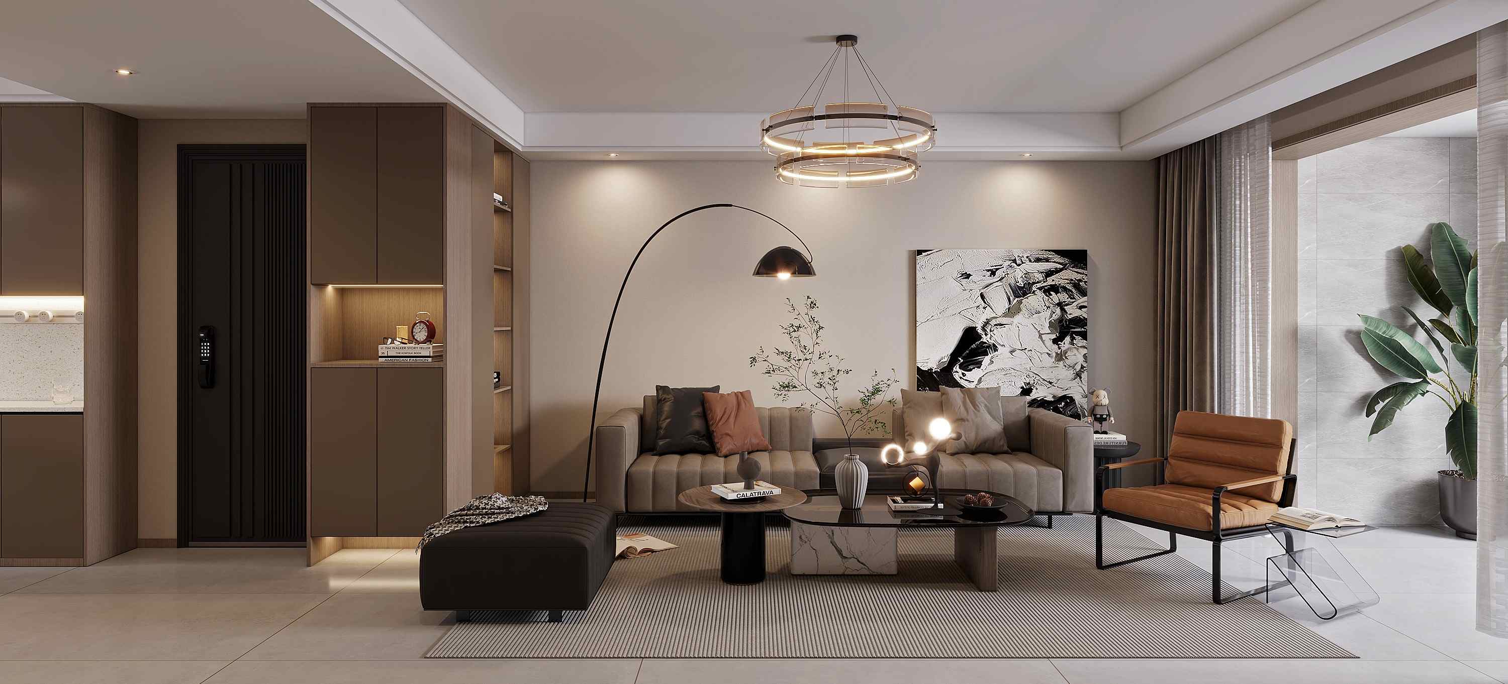 现代简约风格,以柔和的暖灰色调为主,搭配木饰面与金属元素,通过无主灯设计、悬浮式玄关柜与通透的客餐厅布局,营造出温馨雅致且富有层次的居住氛围。