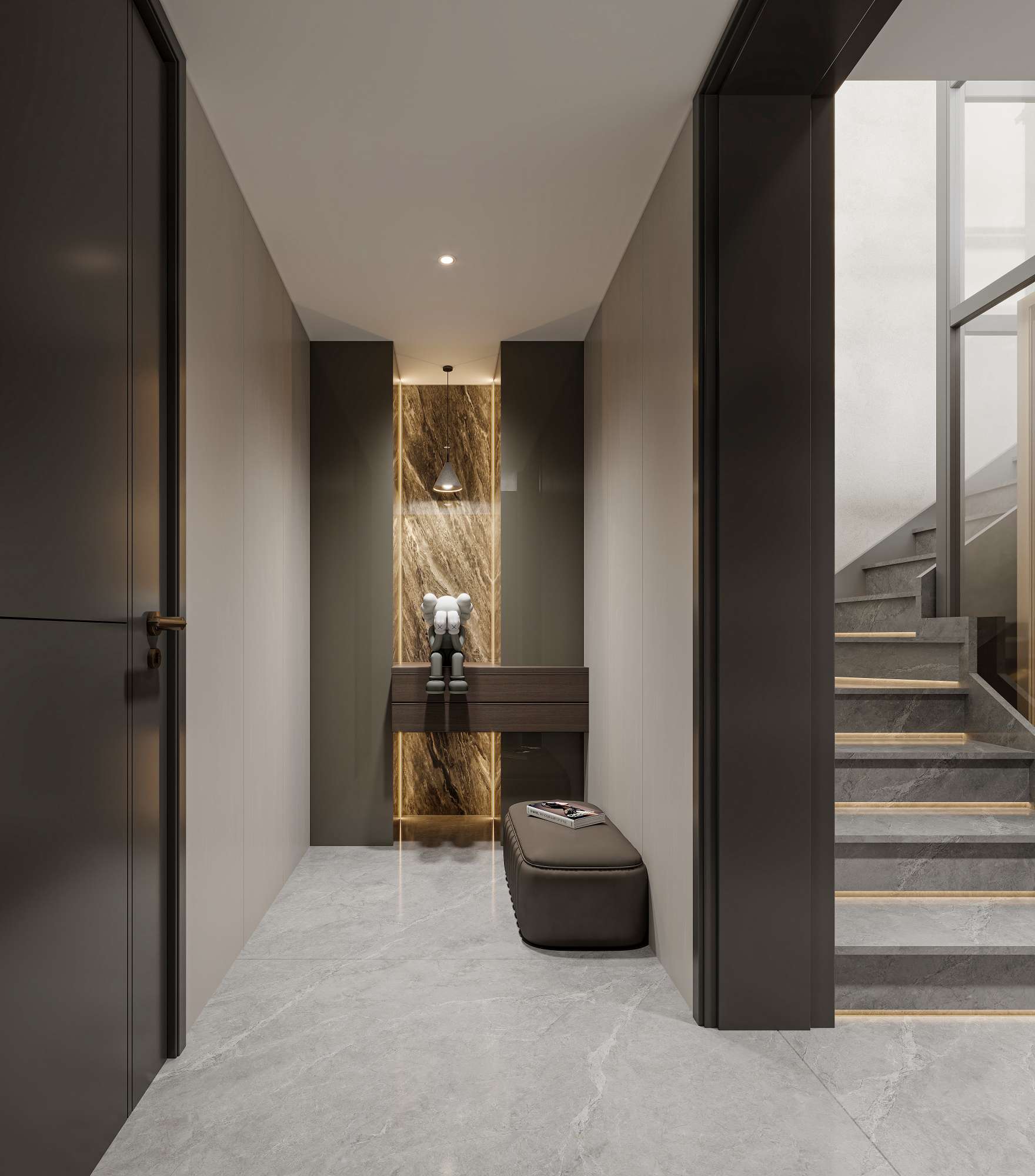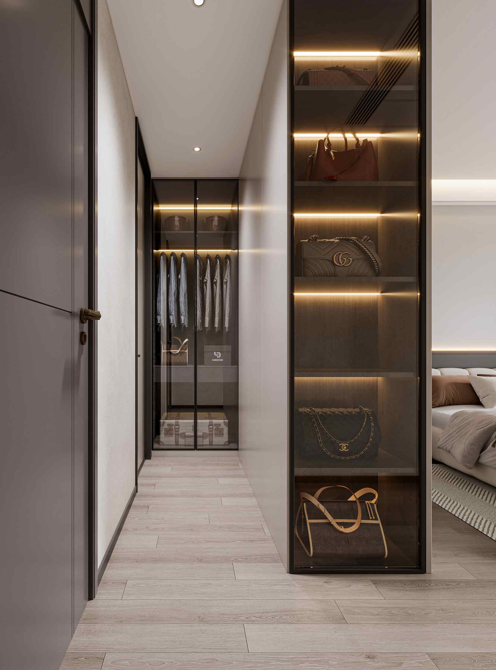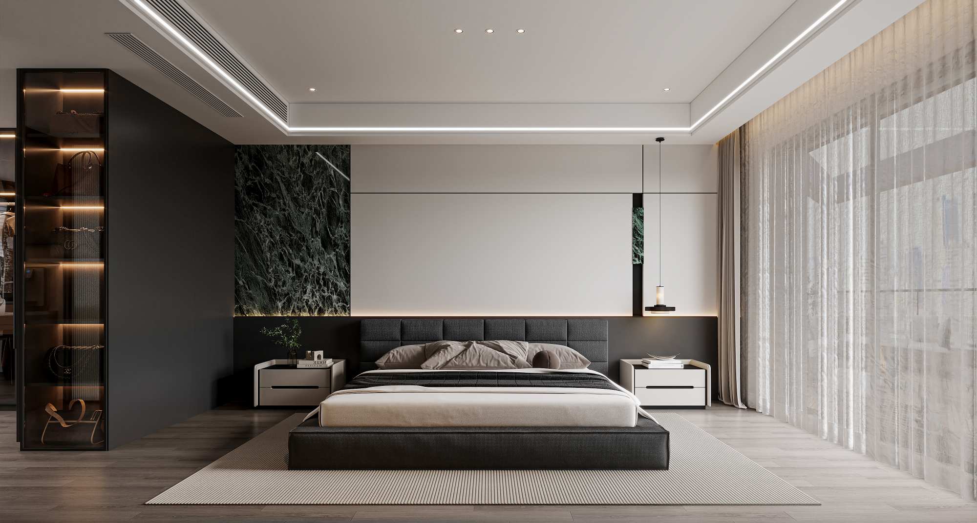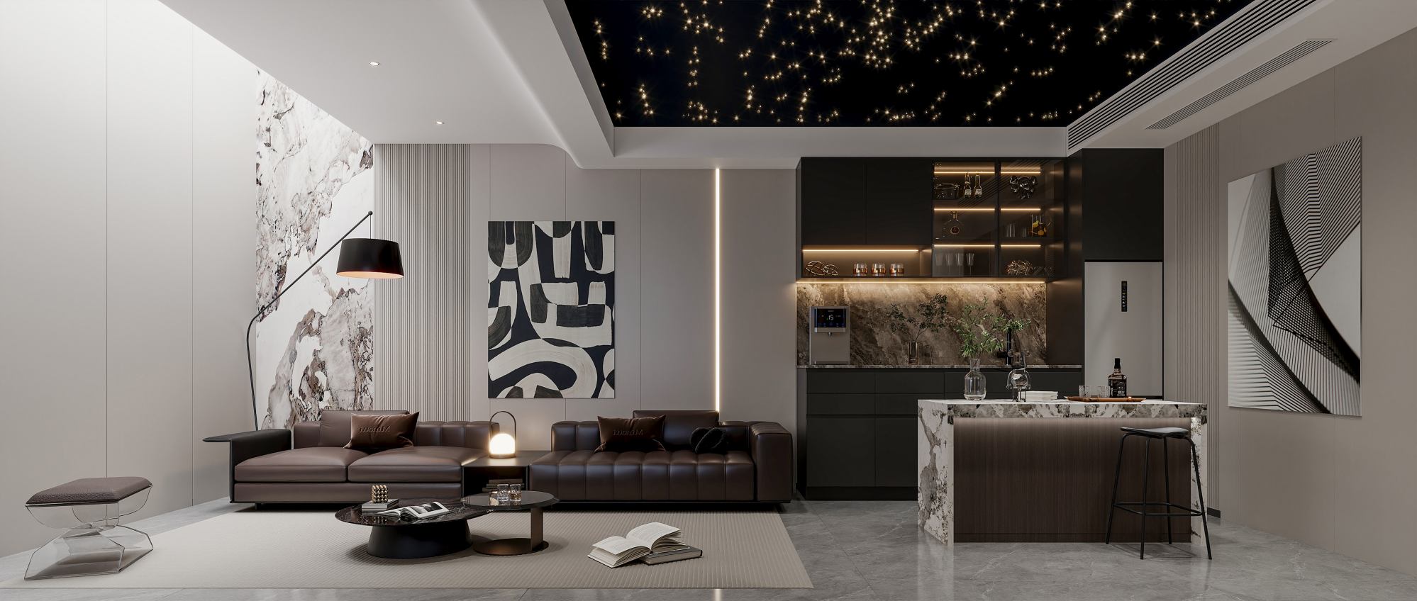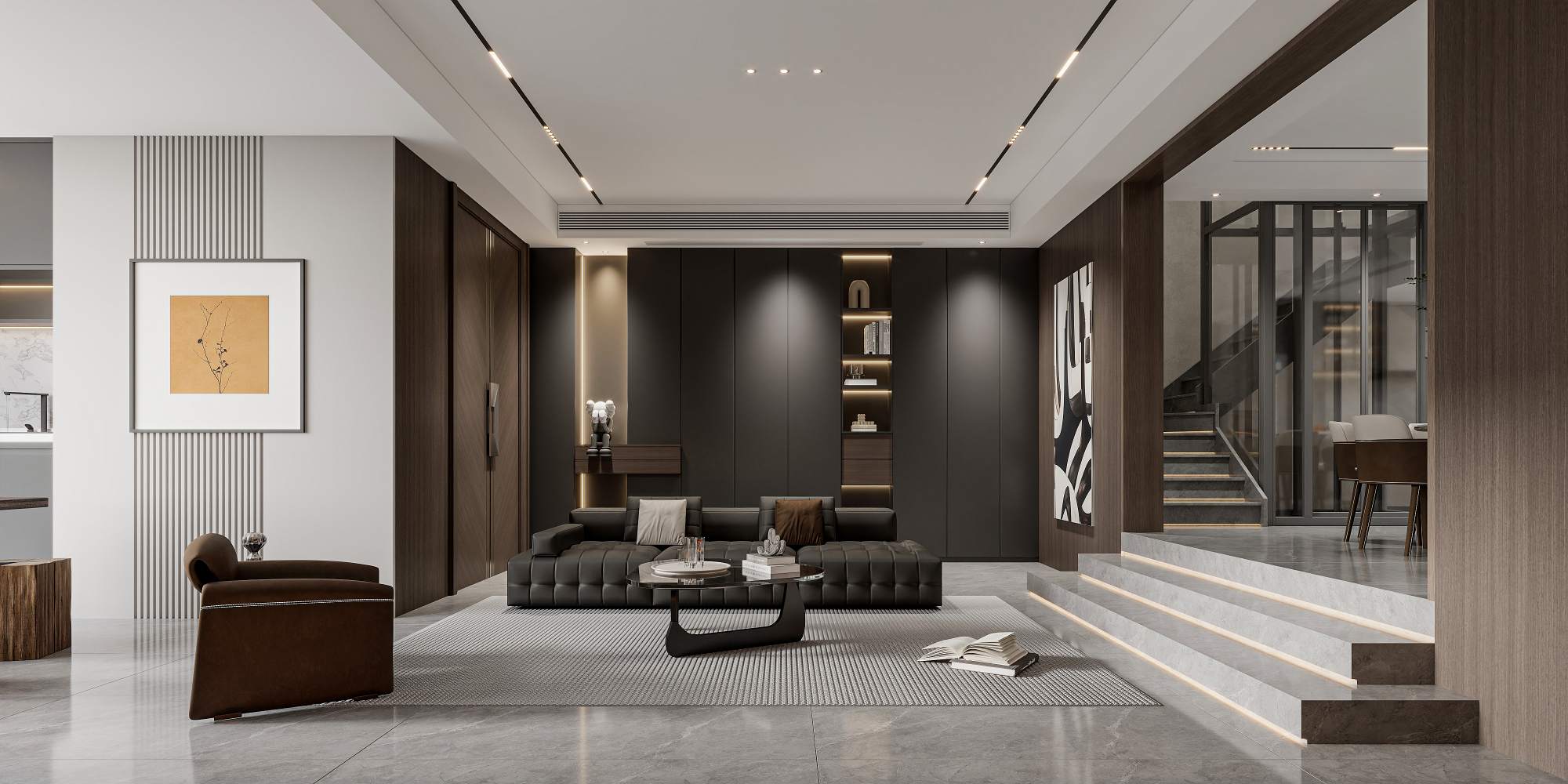 现代轻奢风格,以深木色、灰色与白色为主调,搭配岩板、金属线条与电子壁炉,通过悬浮式电视墙、无主灯设计与通透玻璃柜,营造出沉稳奢华且富有科技感的高端居住体验。