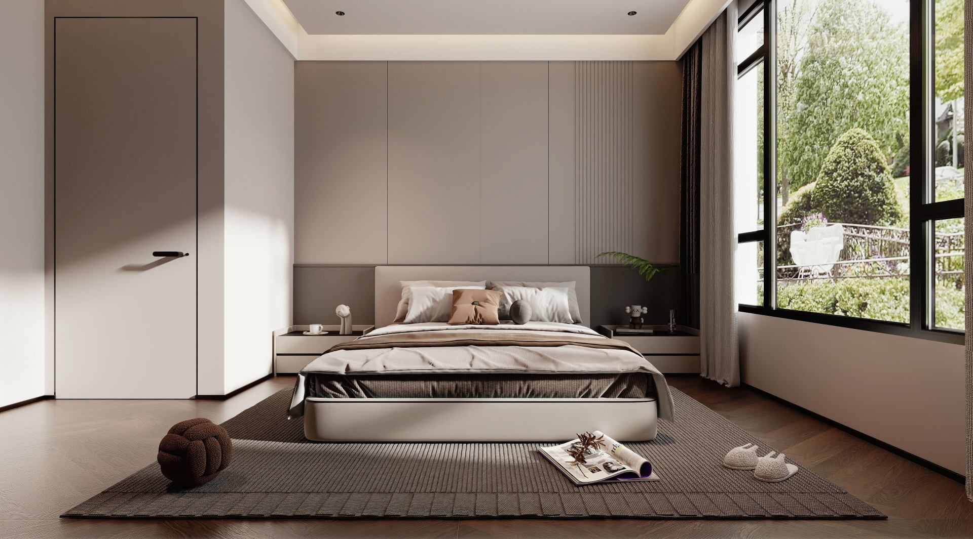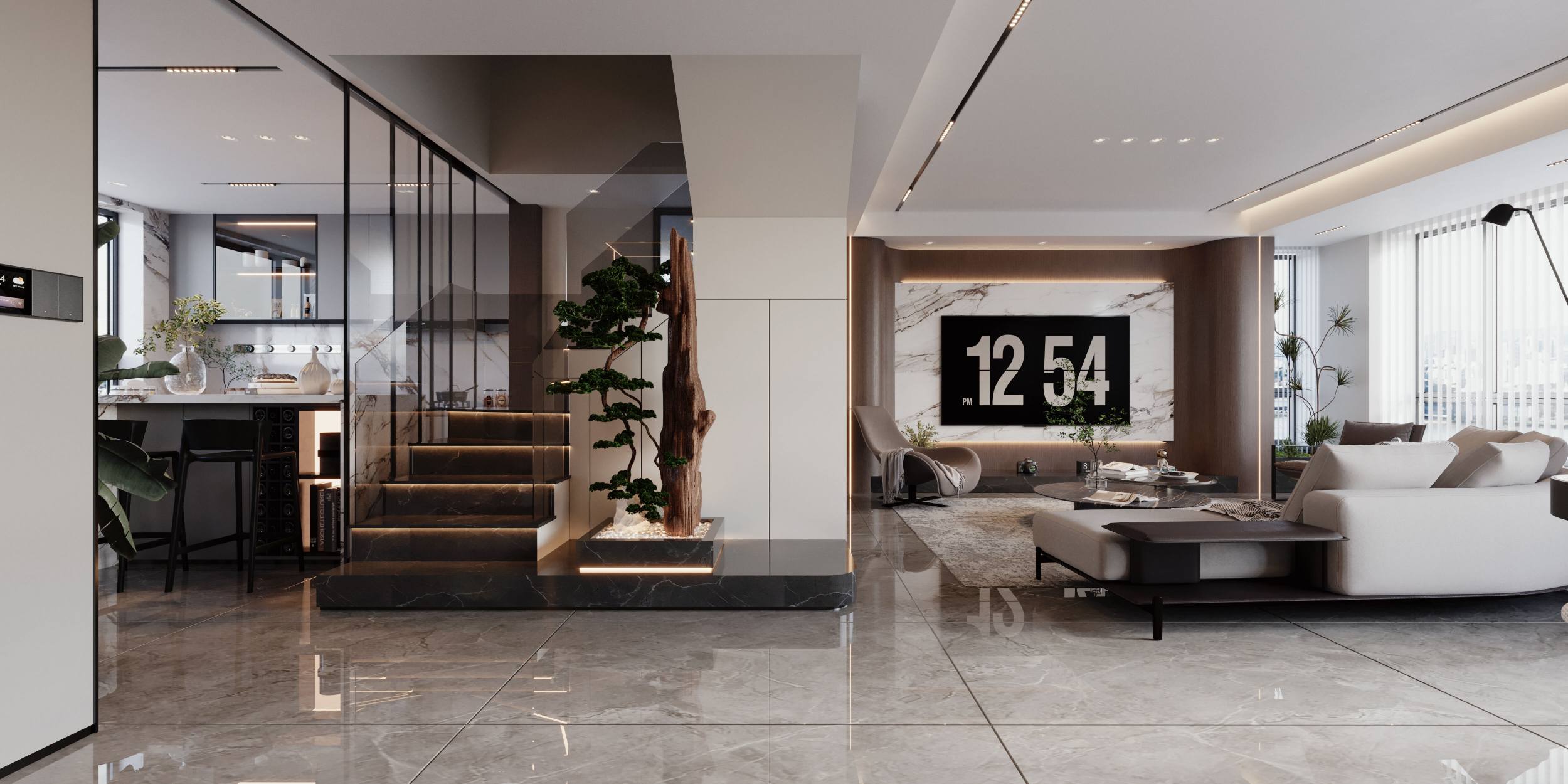 以黑白灰为主调,搭配木饰面与玻璃元素,通过悬浮式岩板电视墙、玻璃楼梯与无主灯设计,营造出通透大气且富有层次的高端居住体验。